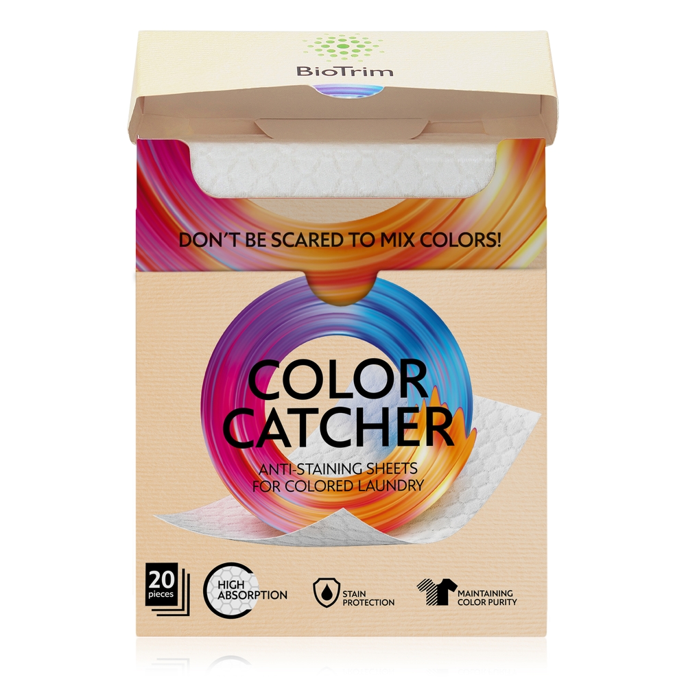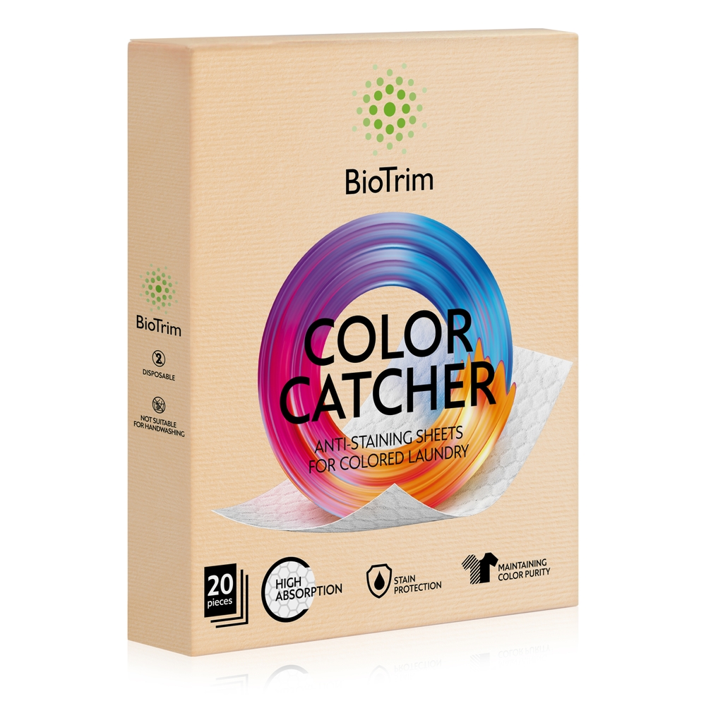 Obrúsky proti zafarbeniu BioTrim Color Catcher je nepostrádateľný produkt na starostlivosť o farebnú bielizeň a oblečenie. Jedinečná štruktúra vysokoabsorpčných vlákien rýchlo absorbuje a uzamyká atramentové pigmenty a malé čiastočky nečistôt, čím pomáha predchádzať vzniku škvŕn a zachováva čistotu farieb bielizne a oblečenia.